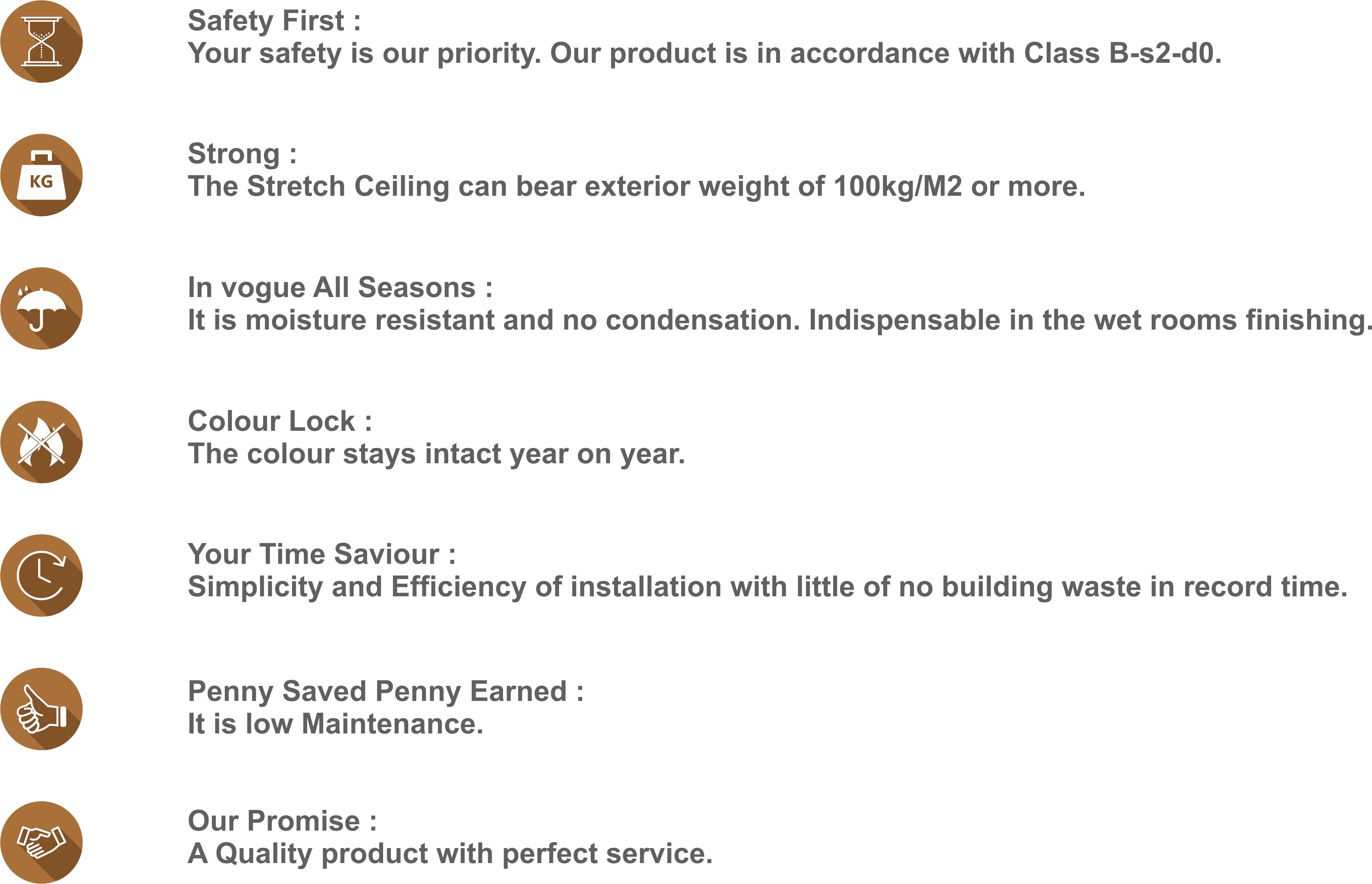 Manufactured with PVC material, the ceiling is provided with excellent insulation function, which can numerously lower the loss of interior temperature, especially the place where turn on air-condition frequently. Its principle is the same as diver wearing PVC divined to delay body temperature from losing in seawater. Furthermore, the surface of the ceiling is made by the principle of film screen. You will find numerous concave and wale if scrutinize surface, which are designed for the purpose of strengthening reflection. Therefore, we encourage the users to install wall lamp or reflection light for better illumination effect, which also reduces lamp quantity.